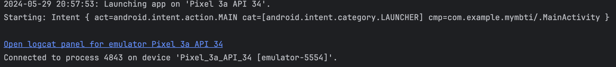 API 버전 : 오타를 고치고나서 밑에 문구가 발생하였는데 Pixel 3a API 34 device로 연결하라는 것 같았다.