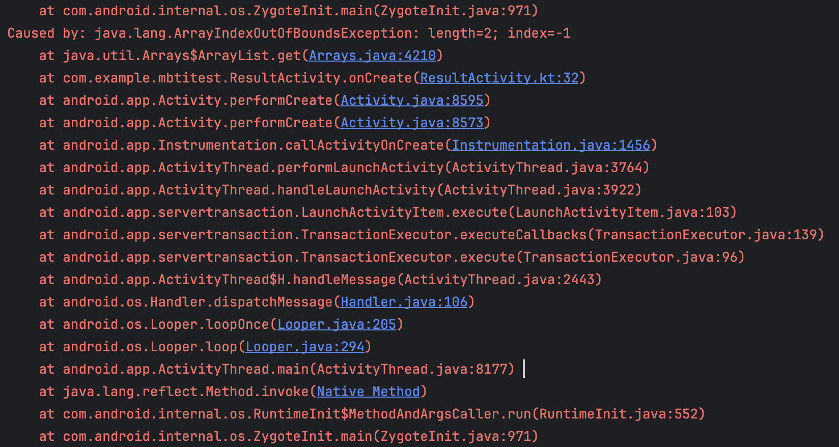(튜터님이 Logcat에 ResultActivity.kt: 32 적혀있는 걸 보고 확인해보시더니 잘못 적은 부분을 찾아주셨다.) ResultActivity 32번째 줄에 원래는 사진과 같이 results[i]-1로 작성해야하는데 실수로 results[i]-i로 작성해서 결과 화면이 나오질 않았던 것..