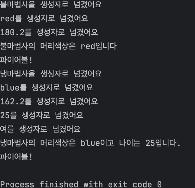 -> 부생성자로 넘긴 내용들이 먼저 나오고 그 이후 작성한 println문과 fireBall() 내용이 출력되는 걸 볼 수 있음